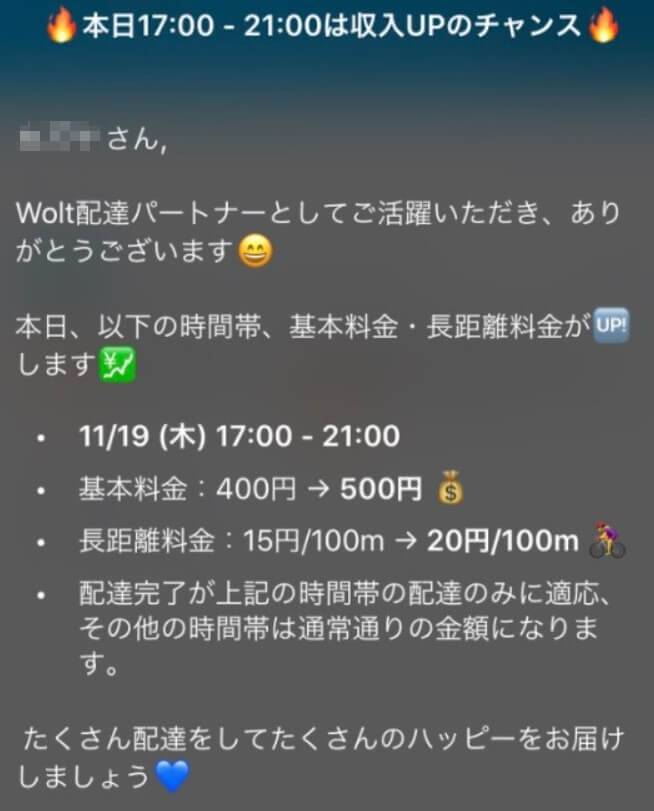 エリア限定ボーナスと時間限定ボーナスは、雨などの悪天候で配達員不足の時に不定期で開催される追加報酬の事です。